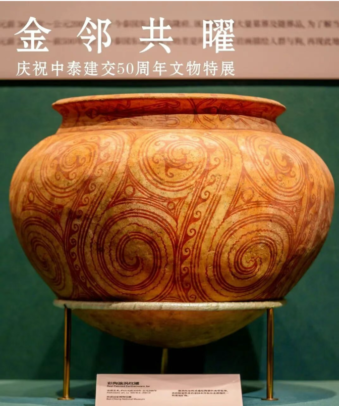 展览汇聚来自泰国11家国家博物馆及机构的众多珍品,包括班清国家博物馆彩陶漩涡纹罐、兰甘亨国家博物馆白地褐彩贴塑神像山墙装饰、昭三帕耶国家博物馆青铜施降魔印宝冠佛像与金嵌玻璃朱拉蒙固冠、泰国国家博物馆木雕贴金花叶纹宝座,以及文化部艺术局传统工艺办公室素攀纳洪号御船模型和孔剧面具等。故宫博物院亦精选多件藏品共襄盛举,如金叶表文、釉上彩神像纹碗、白色缎绣云蝠团龙纹男蟒、紫檀边座平金绣九龙屏风等。展览尾声特别呈现来自故宫博物院与泰国哈利奔猜国家博物馆的两尊吉象,既突显“象”题材在两国不同文化背景下共有的吉祥寓意,更以“象”为寓串联古今,凸显中泰友好交往的佳话所焕发出的时代光辉。