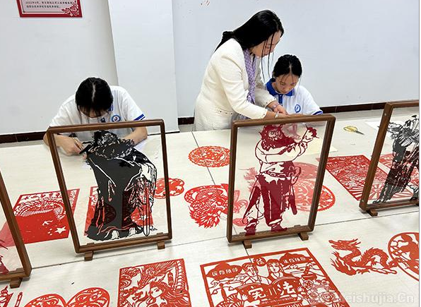 安徽灵璧县高级职业技术学校学生在老师的指导下学习钟馗剪纸