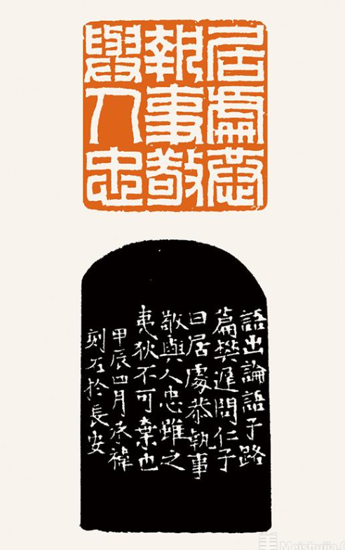 西安美术学院左承祎创作的《居处恭,执事敬,与人忠》语出《论语·子路篇》。此印以汉印风格创作,字法来源于汉印文字,全印九个字三列三行均匀排布。文字字形饱满,笔画方中寓圆,追摩古铜印在转折与收口处的錾刻效果。章法上既与原文断句相呼应,整体稳重、大气,与文意相符,体现篆刻艺术的“以文载道”。