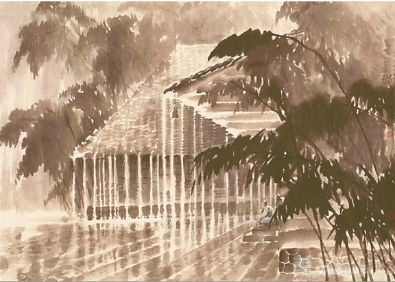 刘墉的山水题材画作呈现出古典与现代、写实与虚幻、师古与创新等多重面貌。其传统笔墨功底扎实,文化积淀厚重,笔下作品蕴含古意、暗合诗境,既精准诠释“师古而不泥古”的创作理念,更将对中华传统文化的深刻体悟融于毫端。在“师古”基础上,刘墉尤重实景写生。他以自然为师,观察自然,研究自然,行旅之中随画笔记录风光景致,秋林寒草、群山飞瀑、烟岚云岫、曙光映照等自然风景皆是他描绘的对象,通过内心的感悟转化为诉诸笔端的视觉图像。“墨境山河·心游万千”单元中的《王维诗意四联屏》《檐前听雨雨霖铃》就呈现了这种特点。他亦未囿于传统山水技法的藩篱,自20世纪70年代初,具有实验和创新精神的他以喷染褶皱皴擦法为突破,创作现代水墨作品,巧妙地将现代喷墨技巧与传统中国画技法相结合,喷染用于营造气氛,褶皱用于强化质感,再融合皴擦、剪贴、磨蚀等多种技法,产生如梦如幻的画境,形成别具一格的艺术面貌。自言“读晚明小品,最爱张岱之湖心亭看雪”的他,以防染、喷染与传统技法结合的手法,绘出《湖心亭看雪》,探索张力与现代气息,更蕴藏着深邃的艺术哲思。