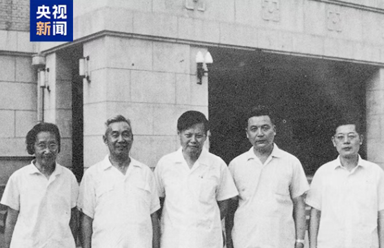 1972年杨振宁与王承书(左一)、张文裕(左二)、邓稼先(右二)、周光召(右一)于北京