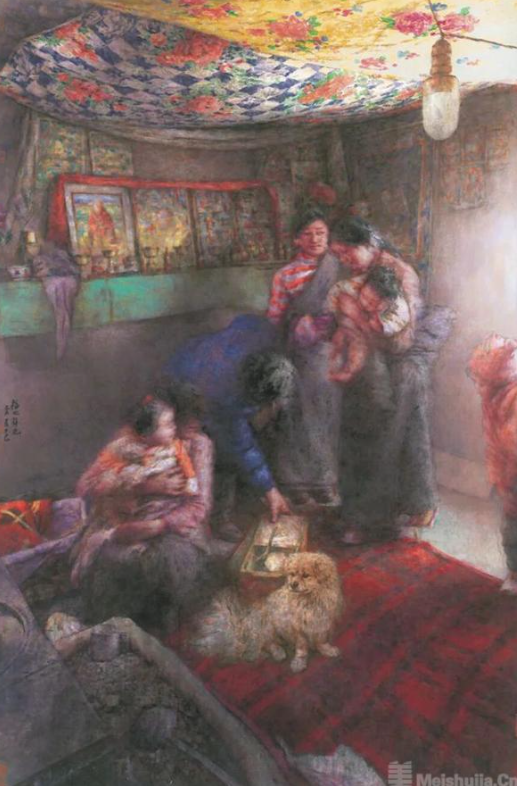 这幅作品是在照相机低像素的情况下拍摄的相片中找到的灵感,以真人、真物、真景的方式来展示画面,近景的火炉、小狗和房子的顶棚、电灯是写实的,人物和其他环境是虚化的。近景和房顶的写真加强了人物及背景的虚幻程度,让整个画面气氛笼罩在似云似梦的迷蒙之中。西藏的冬天是寒冷的,海拔一般都在4500米左右,而在作品中的屋里却体现的是暖洋洋的感觉。一位妇女怀抱着孩子坐在火炉旁,老人在挪动盛煤的小箱子,这时刚进门的小女孩,没去看另外一位妇女在为孩子换衣裤而是在看老人如何搬弄小箱子,最后站在墙角的少女在给孩子拿着裤子。墙上供奉着班禅们的佛像、地下铺着厚厚的地毯、房子的顶棚是两块被单相拼而成的,虽然简陋,但却掩饰不了藏族同胞朴素、纯厚的性格,她们在以炙热的情怀享受着雪域高原赐予他们的幸福。画中这种家庭和谐生活的场景让人产生对甜蜜生活的向往,对美好生活的追求。