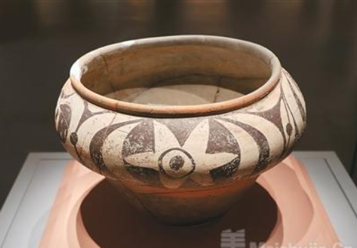 崔家河遗址是山西运城盆地东部的一处中心聚落,繁盛于庙底沟文化时期,面积超过50万平方米。展出的崔家河遗址出土陶器中,有一件鱼纹彩陶盆很特别,为泥质红陶,腹部绘写实鱼纹。这种纹饰在庙底沟文化中并不多见,是年代早于庙底沟文化、以渭河流域为中心分布的半坡文化彩陶的代表性纹饰。这件陶盆宽折沿、直腹、大平底的造型,在庙底沟文化陶器中也不常见,而与湖北、河南等地出土的同时期器物形制相似,显示出多地区文化交流互动的现象。