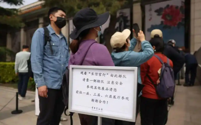 今天(4月18日)是长信宫灯亮相首日,记者来到中国美术馆,看到观众在院内排起长队,现场有工作人员维持秩序,并拿着喇叭在室外进行引导:看长信宫灯的观众请在此排队,参观其他展览及展品的观众请直接前往展厅参观。