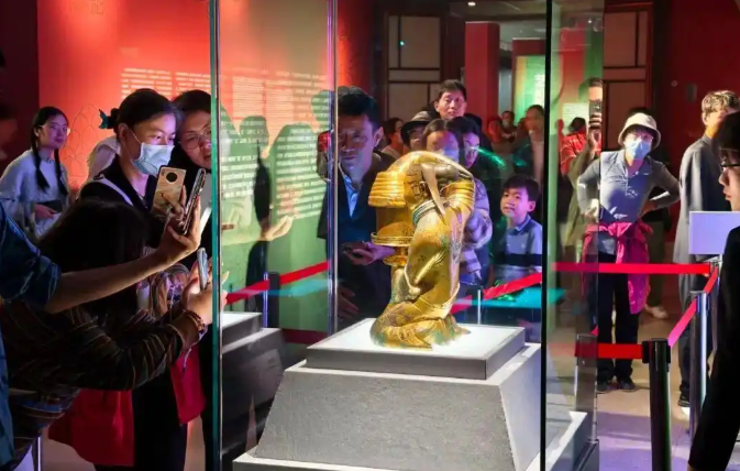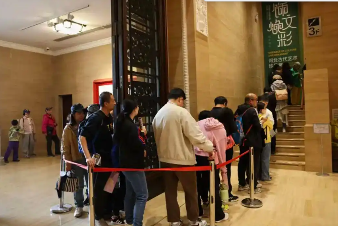 下午3点左右,距离闭馆还有两小时,观众热情不减,来看长信宫灯的队伍依然从五楼排到一楼,甚至延伸到室外。有工作人员对记者表示,“如果排队的人很多,该展厅可能会延长观展时间,但目前暂未收到通知。”