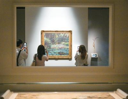策展团队巧妙运用场景设计,带领观众进入“造园”“游园”和“赏园”三重意境,展品涵盖绘画、版画、漆器、雕塑、陶瓷器、玻璃器等。北京故宫博物院珍藏的明代文徵明《兰亭修禊图》,重现东晋王羲之笔下传颂千古的兰亭雅集情景;《避暑山庄图》则融合了青绿山水与西洋透视技法,体现了清代皇家园林气派。美国芝加哥艺术博物馆展出画家莫奈的作品《睡莲》和《睡莲池》,香港艺术馆则展出馆藏张大千的《八德园迎客径》和《泼彩山水》。