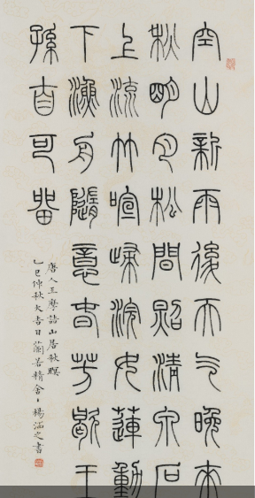 杨华以楷书立基,兼融篆意,数十载沉潜于欧阳询法度,涵泳颜褚气象,自成格局。其楷书于端严中见灵动,平正中蕴险绝,既承续唐楷之正脉,又注入当代审美之思辨,并以结构的精微、章法的秩序,探寻字里行间的和谐之美。
